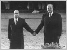 Ca moulinait fort dans mon crâne : je me préparais, en désespoir de cause, à invoquer l’amitié franco-allemande. Nous venions de nous donner la main pour reproduire en salle d’examen le geste tout récent de François Mitterrand et d’Helmut Kohl à Verdun, pour symboliser l’omniprésence de la paix triomphante jusque dans la salle d’examen, etc… Entraînée par tant de beauté, la copie avait suivi le mouvement et était restée bien malencontreusement et involontairement collée au milieu de nos bras tendus à travers l’allée.